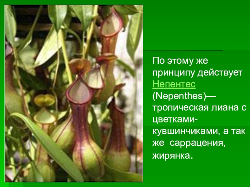 Слайд 23 По этому же принципу действует Непентес (Nepenthes)— тропическая лиана