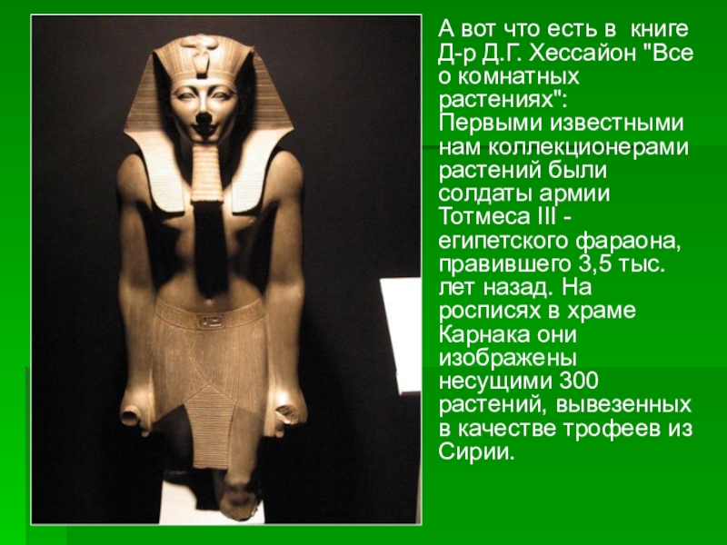 Первыми известными нам коллекционерами растений были солдаты армии Тотмеса III - египетского фараона, правившего 3,5 тыс. лет назад. На росписях в храме Карнака они изображены несущими 300 растений, вывезенных в качестве трофеев из Сирии.