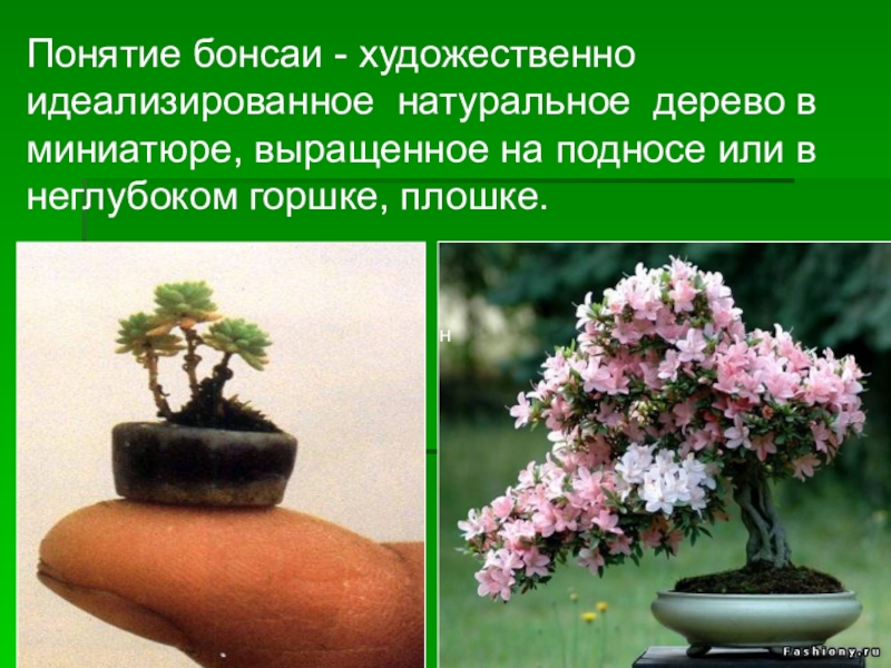 Слайд 10Понятие бонсаи - художественно идеализированное натуральное дерево в миниатюре, выращенное на