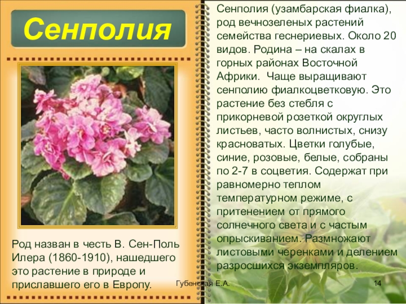Род назван в честь В. Сен-Поль Илера (1860-1910), нашедшего это растение в природе и приславшего его в Европу.