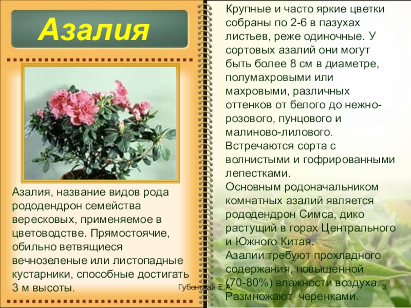 Азалия, название видов рода рододендрон семейства вересковых, применяемое в цветоводстве. Прямостоячие, обильно ветвящиеся вечнозеленые или листопадные кустарники, способные достигать 3 м высоты.
