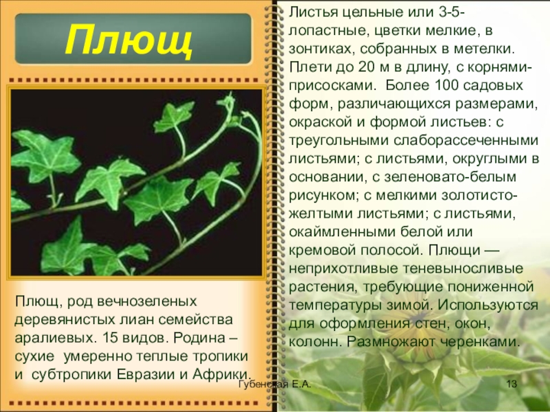 Плющ, род вечнозеленых деревянистых лиан семейства аралиевых. 15 видов. Родина – сухие умеренно теплые тропики и субтропики Евразии и Африки.