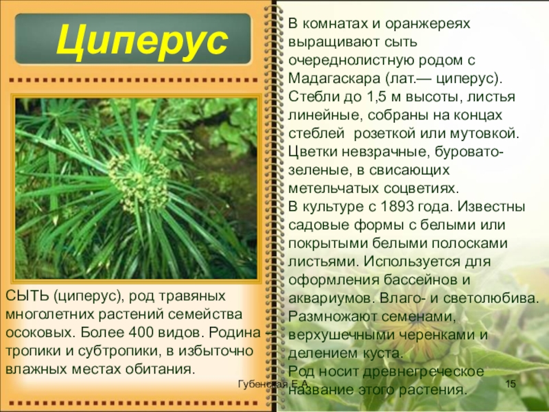 В комнатах и оранжереях выращивают сыть очереднолистную родом с Мадагаскара (лат.— циперус). Стебли до 1,5 м высоты, листья линейные, собраны на концах стеблей розеткой или мутовкой. Цветки невзрачные, буровато-зеленые, в свисающих метельчатых соцветиях.