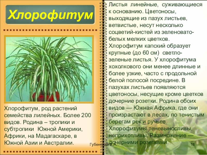 Хлорофитум, род растений семейства лилейных. Более 200 видов. Родина – тропики и субтропики Южной Америки, Африки, на Мадагаскаре, в Южной Азии и Австралии.
