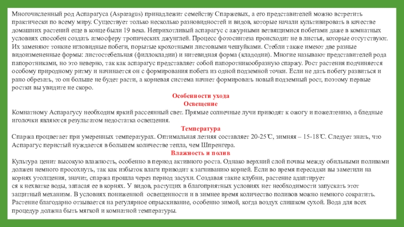 Слайд 3Многочисленный род Аспарагуса (Asparagus) принадлежит семейству Спаржевых, а его представителей можно