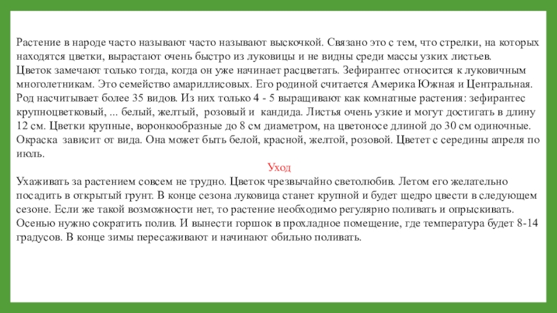 Цветок замечают только тогда, когда он уже начинает расцветать. Зефирантес относится к луковичным многолетникам. Это семейство амариллисовых. Его родиной считается Америка Южная и Центральная. Род насчитывает более 35 видов. Из них только 4 - 5 выращивают как комнатные растения: зефирантес крупноцветковый, ... белый, желтый, розовый и кандида. Листья очень узкие и могут достигать в длину 12 см. Цветки крупные, воронкообразные до 8 см диаметром, на цветоносе длиной до 30 см одиночные. Окраска зависит от вида. Она может быть белой, красной, желтой, розовой. Цветет с середины апреля по июль.