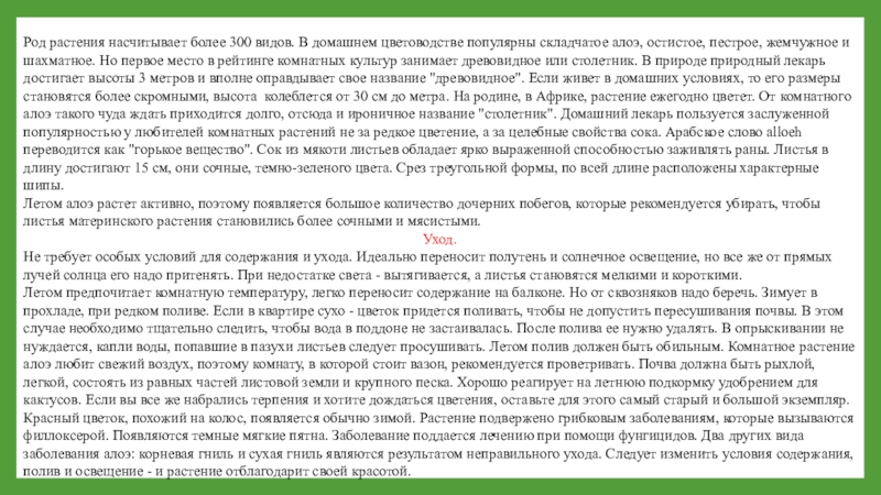 Летом алоэ растет активно, поэтому появляется большое количество дочерних побегов, которые рекомендуется убирать, чтобы листья материнского растения становились более сочными и мясистыми.