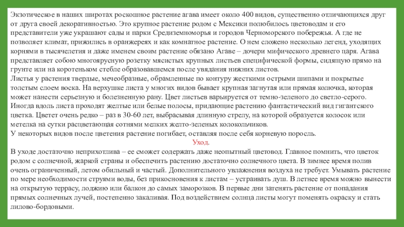 Слайд 5Экзотическое в наших широтах роскошное растение агава имеет около 400 видов,