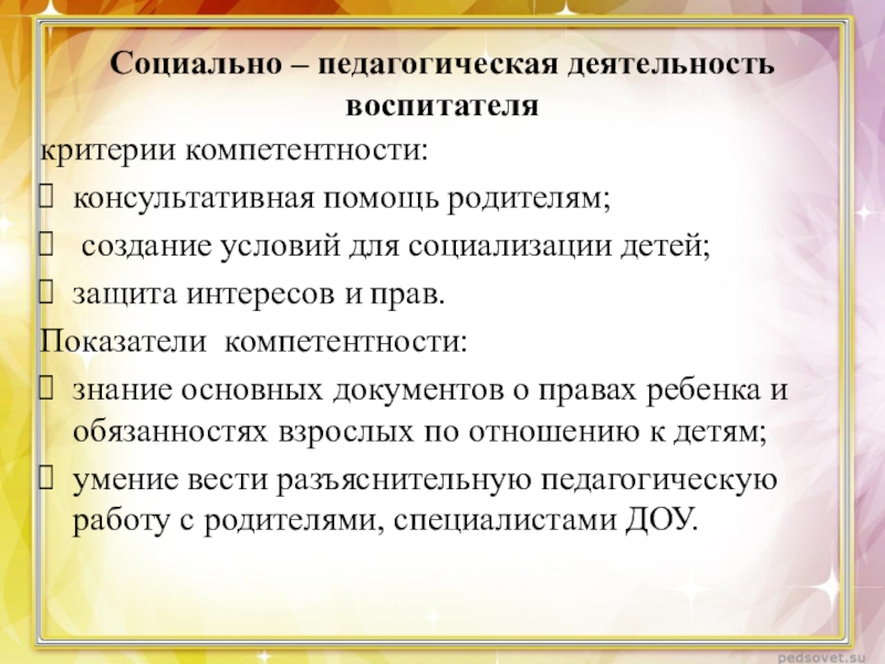 Слайд 11Социально – педагогическая деятельность воспитателя