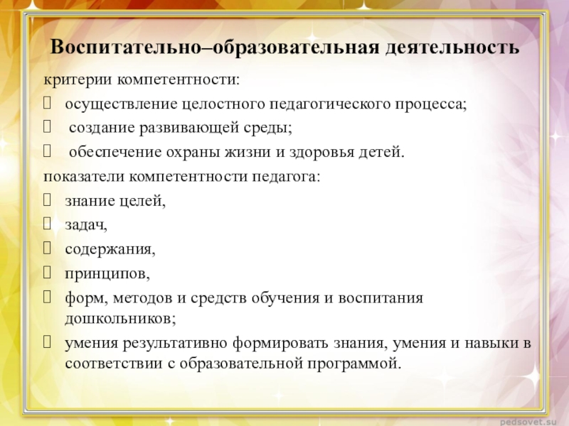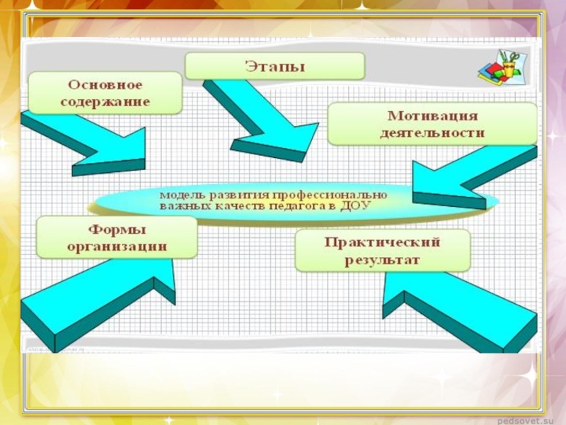 специфических профессиональных установок, позволяющих ему справляться с заданной программой и особыми, возникающими в психолого – педагогическом процессе дошкольного учреждения, ситуациями, разрешая которые, он способствует уточнению, совершенствованию, практическому воплощению задач развития, его общих и специальных способностей.