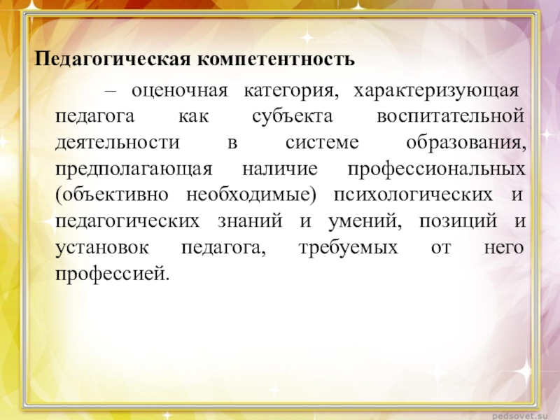 Понятие компетентности педагога понимается как ценностно-смысловое отношение к целям и результатам