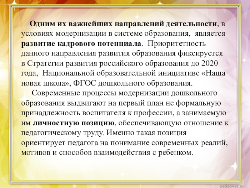системе образования, является развитие кадрового потенциала. Приоритетность данного направления развития образования фиксируется в Стратегии развития российского образования до 2020 года, Национальной образовательной инициативе «Наша новая школа», ФГОС дошкольного образования.