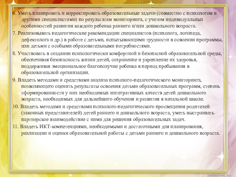 9. Владеть методами и средствами анализа психолого-педагогического мониторинга, позволяющего оценить результаты освоения детьми образовательных программ, степень сформированности у них необходимых интегративных качеств детей дошкольного возраста, необходимых для дальнейшего обучения и развития в начальной школе.