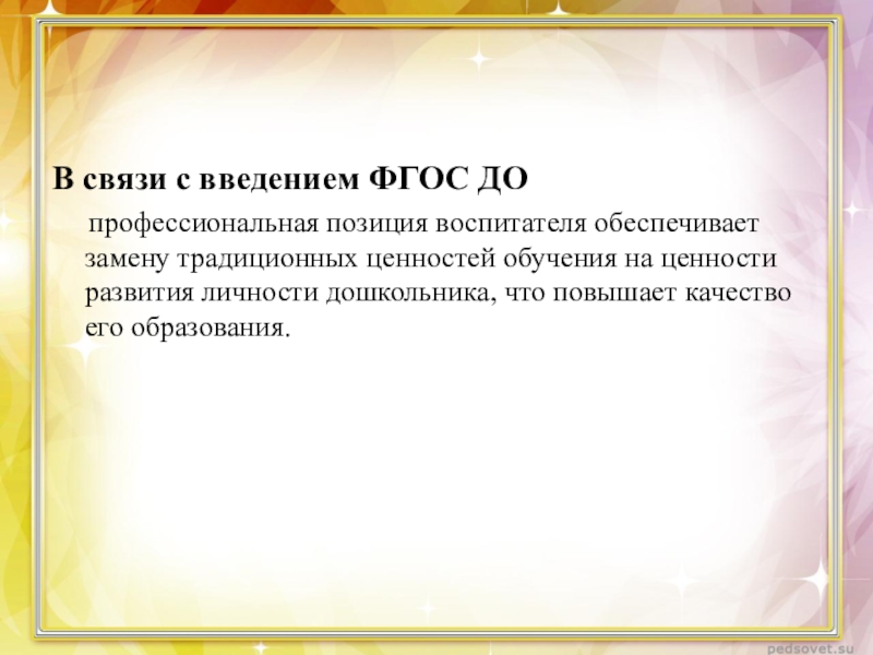 воспитателя обеспечивает замену традиционных ценностей обучения на ценности развития личности дошкольника, что повышает качество его образования.