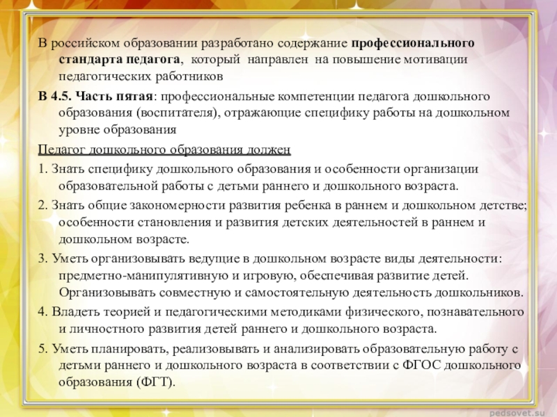 В 4.5. Часть пятая: профессиональные компетенции педагога дошкольного образования (воспитателя), отражающие специфику работы на дошкольном уровне образования