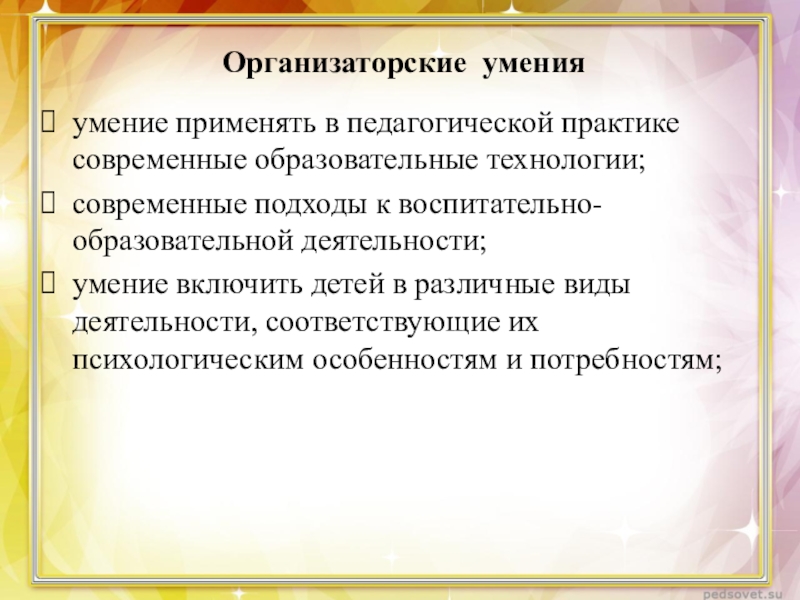 умение включить детей в различные виды деятельности, соответствующие их психологическим особенностям и потребностям;