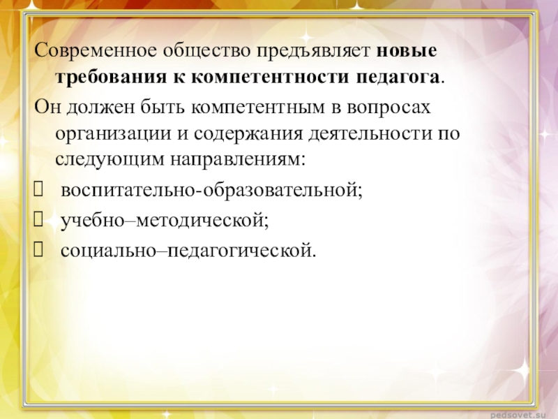 Слайд 8Современное общество предъявляет новые требования к компетентности педагога.