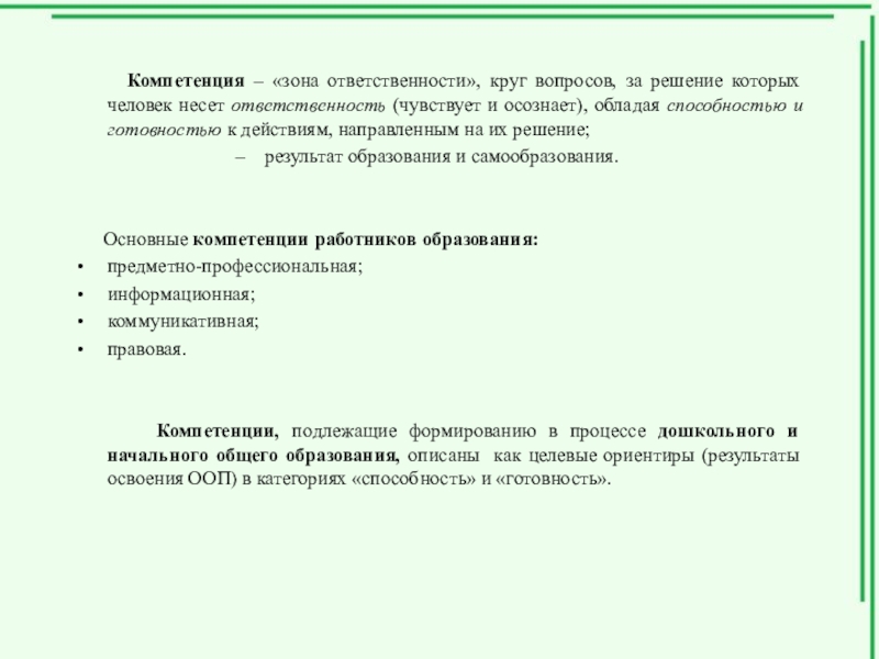 Компетенции, подлежащие формированию в процессе дошкольного и начального общего образования, описаны как целевые ориентиры (результаты освоения ООП) в категориях «способность» и «готовность».