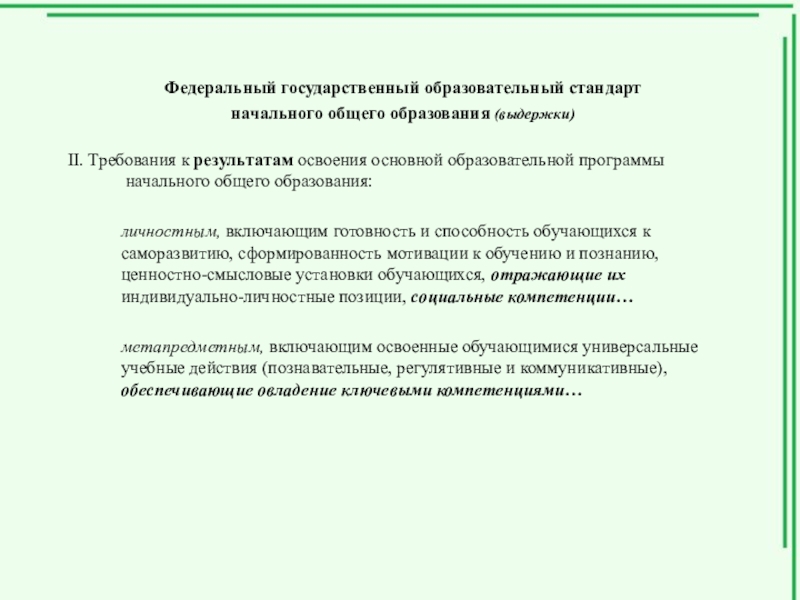 личностным, включающим готовность и способность обучающихся к саморазвитию, сформированность мотивации к обучению и познанию, ценностно-смысловые установки обучающихся, отражающие их индивидуально-личностные позиции, социальные компетенции…