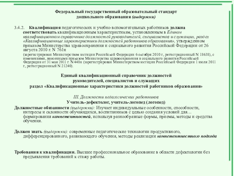 Требования к квалификации. Высшее профессиональное образование в области дефектологии без предъявления требований к стажу работы.