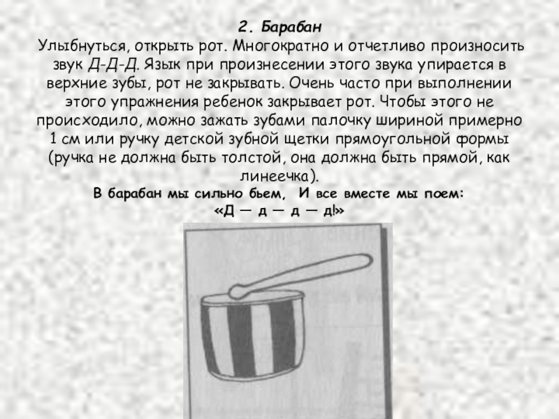 Язык при произнесении этого звука упирается в верхние зубы, рот не закрывать. Очень часто при выполнении этого упражнения ребенок закрывает рот. Чтобы этого не происходило, можно зажать зубами палочку шириной примерно 1 см или ручку детской зубной щетки прямоугольной формы (ручка не должна быть толстой, она должна быть прямой, как линеечка). В барабан мы сильно бьем, И все вместе мы поем: «Д — д — д — д!»