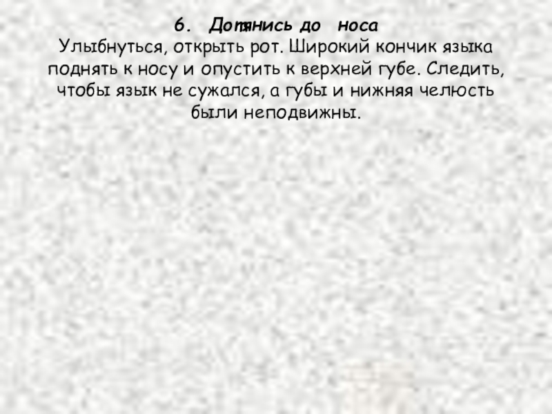 6. Дотянись до носа Улыбнуться, открыть рот. Широкий кончик языка поднять к носу и опустить к верхней