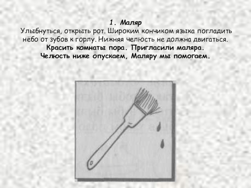 1. Маляр Улыбнуться, открыть рот. Широким кончиком языка погладить нёбо от зубов к горлу. Нижняя челюсть не должна двигаться. Красить комнаты пора. Пригласили маляра. Челюсть ниже опускаем, Маляру мы помогаем.