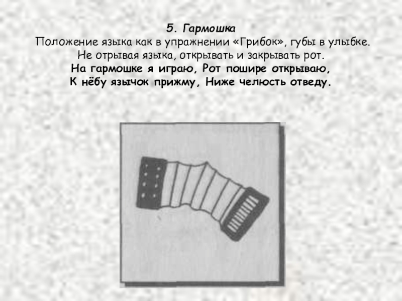 Не отрывая языка, открывать и закрывать рот. На гармошке я играю, Рот пошире открываю, К нёбу язычок прижму, Ниже челюсть отведу.