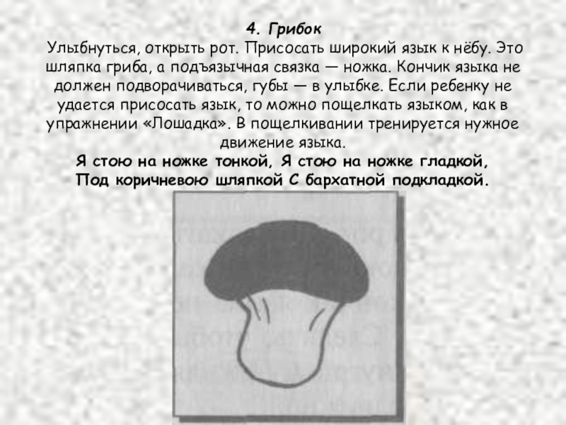 шляпка гриба, а подъязычная связка — ножка. Кончик языка не должен подворачиваться, губы — в улыбке. Если ребенку не удается присосать язык, то можно пощелкать языком, как в упражнении «Лошадка». В пощелкивании тренируется нужное движение языка. Я стою на ножке тонкой, Я стою на ножке гладкой, Под коричневою шляпкой С бархатной подкладкой.
