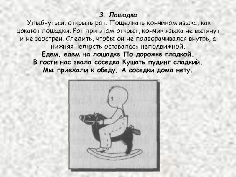 Рот при этом открыт, кончик языка не вытянут и не заострен. Следить, чтобы он не подворачивался внутрь, а нижняя челюсть оставалась неподвижной. Едем, едем на лошадке По дорожке гладкой. В гости нас звала соседка Кушать пудинг сладкий. Мы приехали к обеду, А соседки дома нету.