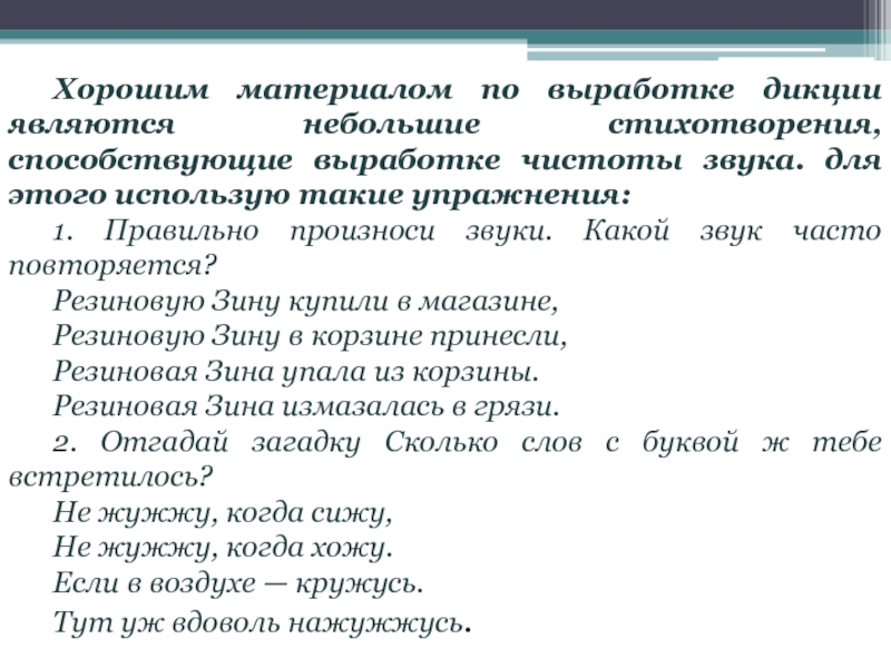 Слайд 8Хорошим материалом по выработке дикции являются небольшие стихотворения, способствующие выработке чистоты