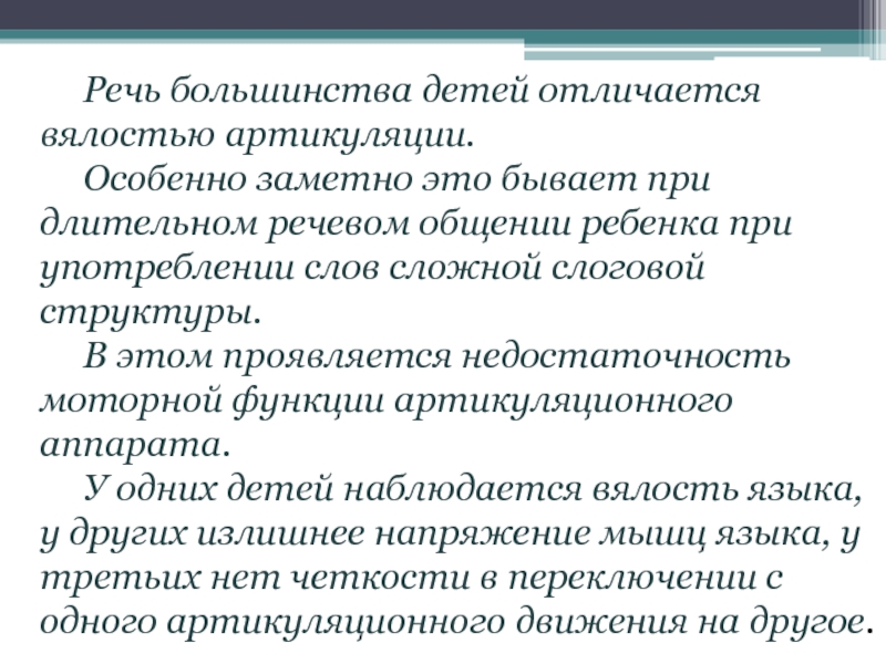 Слайд 4Речь большинства детей отличается вялостью артикуляции.
