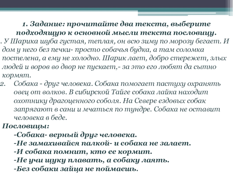 Слайд 531. Задание: прочитайте два текста, выберите подходящую к основной мысли текста