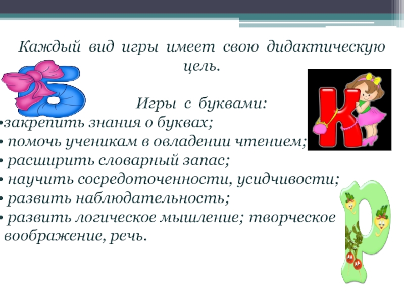 Слайд 10Каждый вид игры имеет свою дидактическую цель.