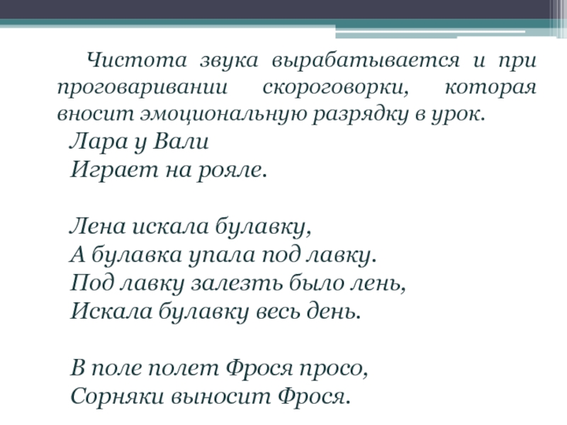 Чистота звука вырабатывается и при проговаривании скороговорки, которая вносит эмоциональную разрядку в урок.