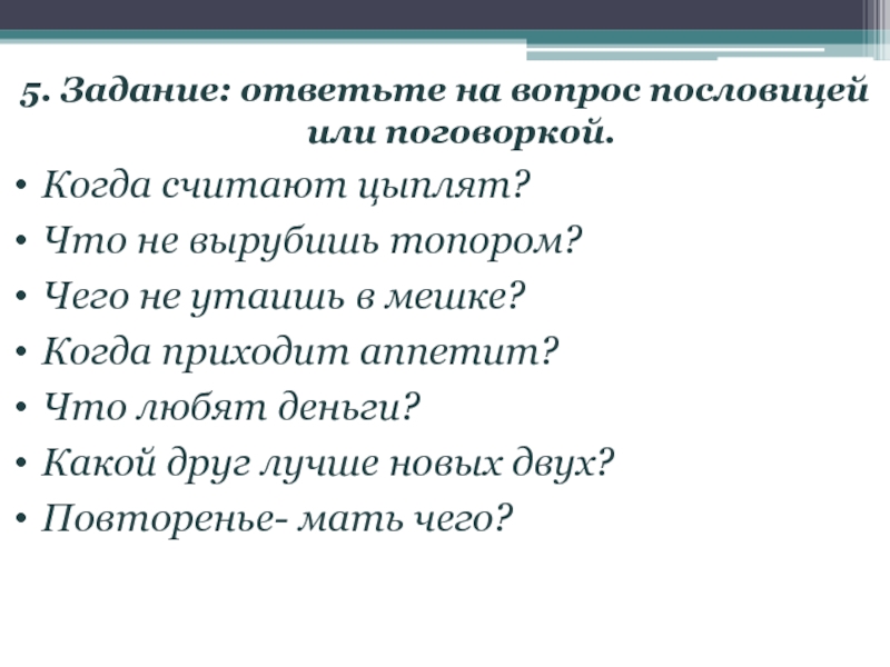 Слайд 575. Задание: ответьте на вопрос пословицей или поговоркой.