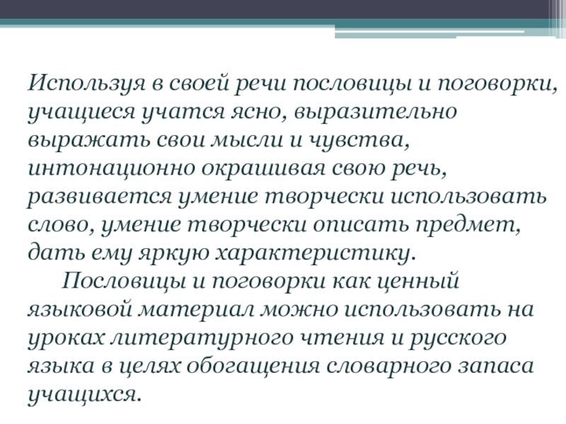 Слайд 52Используя в своей речи пословицы и поговорки, учащиеся учатся ясно, выразительно