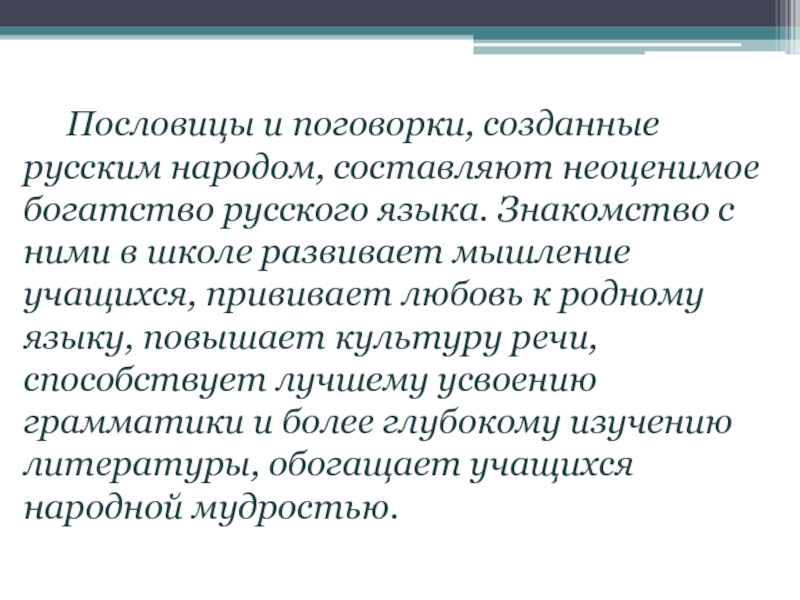 богатство русского языка. Знакомство с ними в школе развивает мышление учащихся, прививает любовь к родному языку, повышает культуру речи, способствует лучшему усвоению грамматики и более глубокому изучению литературы, обогащает учащихся народной мудростью.