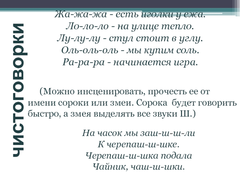 звуки речи, используются чистоговорки, которые необходимы в качестве тренировочных упражнений для развития голосового аппарата (произносить громко, тихо, шепотом), темпа речи (произносить быстро, умеренно, медленно).