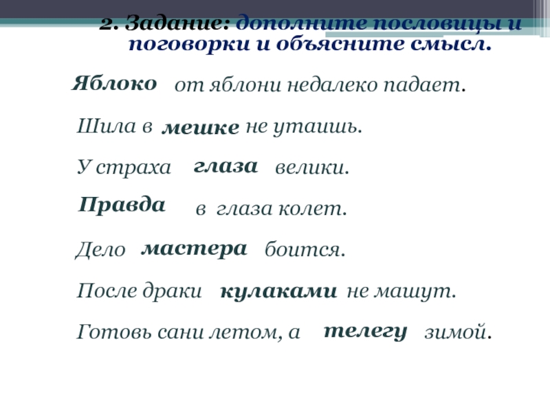 Слайд 542. Задание: дополните пословицы и поговорки и объясните смысл.