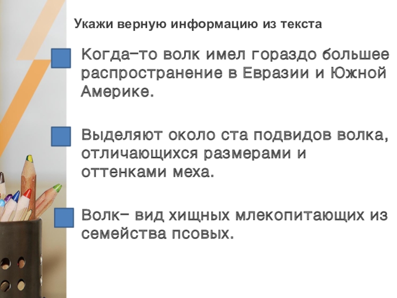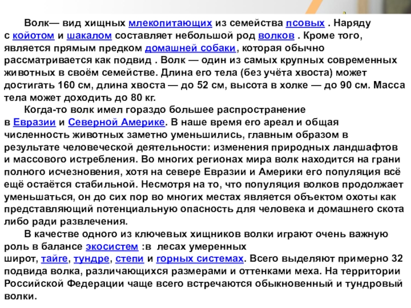 Волк— вид хищных млекопитающих из семейства псовых . Наряду с койотом и шакалом составляет небольшой род волков . Кроме того, является прямым предком домашней собаки, которая обычно рассматривается как подвид . Волк — один из самых крупных современных животных в своём семействе. Длина его тела (без учёта хвоста) может достигать 160 см, длина хвоста — до 52 см, высота в холке — до 90 см. Масса тела может доходить до 80 кг.