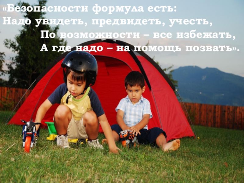 «Безопасности формула есть:Надо увидеть, предвидеть, учесть,По возможности – все избежать,А где надо – на помощь позвать».