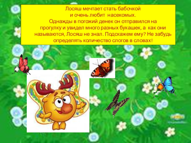 Лосяш мечтает стать бабочкой и очень любит насекомых. Однажды в погожий денек он отправился на прогулку и увидел много разных букашек, а как они называются, Лосяш не знал. Подскажем ему? Не забудьопределять количество слогов в словах!