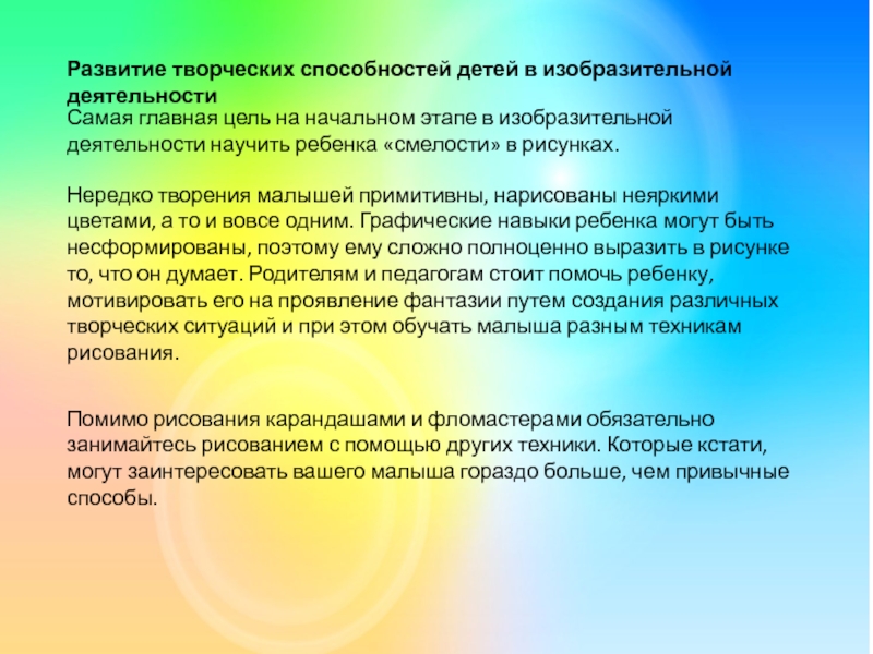 Нередко творения малышей примитивны, нарисованы неяркими цветами, а то и вовсе одним. Графические навыки ребенка могут быть несформированы, поэтому ему сложно полноценно выразить в рисунке то, что он думает. Родителям и педагогам стоит помочь ребенку, мотивировать его на проявление фантазии путем создания различных творческих ситуаций и при этом обучать малыша разным техникам рисования.