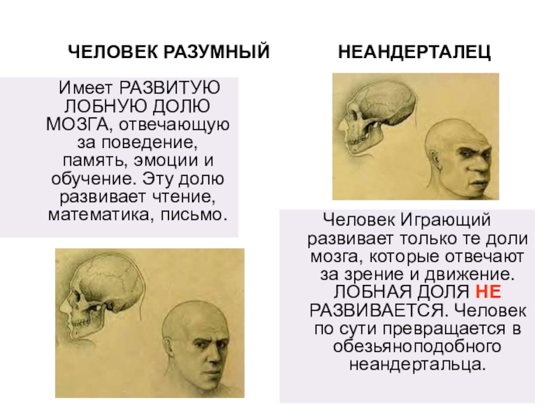Человек Играющий развивает только те доли мозга, которые отвечают за зрение и движение. ЛОБНАЯ ДОЛЯ НЕ РАЗВИВАЕТСЯ. Человек по сути превращается в обезьяноподобного неандертальца.