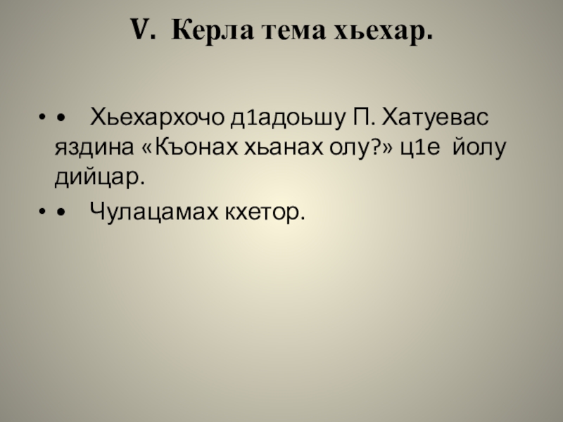 Слайд 8V. Керла тема хьехар.