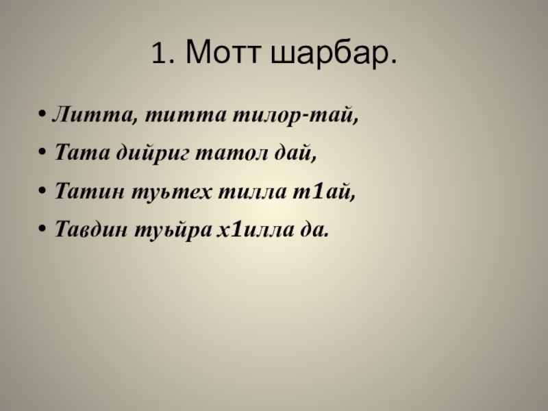 1.	 Мотт шарбар.Литта, титта тилор-тай,Тата дийриг татол дай, Татин туьтех тилла т1ай,Тавдин туьйра х1илла да.