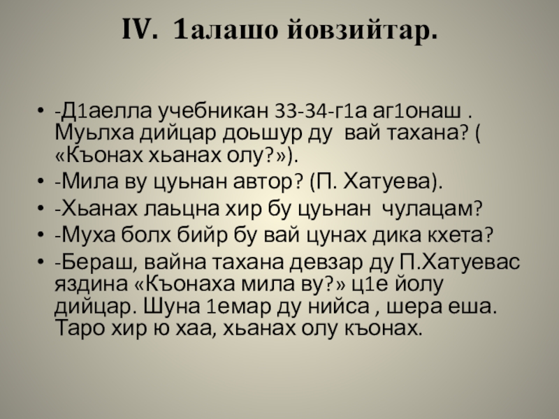 IV. 1алашо йовзийтар. -Д1аелла учебникан 33-34-г1а аг1онаш . Муьлха дийцар доьшур ду вай тахана? ( «Къонах хьанах
