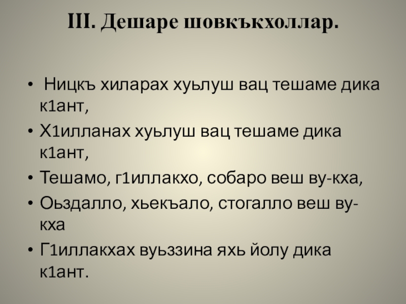 III. Дешаре шовкъкхоллар.  Ницкъ хиларах хуьлуш вац тешаме дика к1ант,Х1илланах хуьлуш вац тешаме дика к1ант,Тешамо, г1иллакхо,