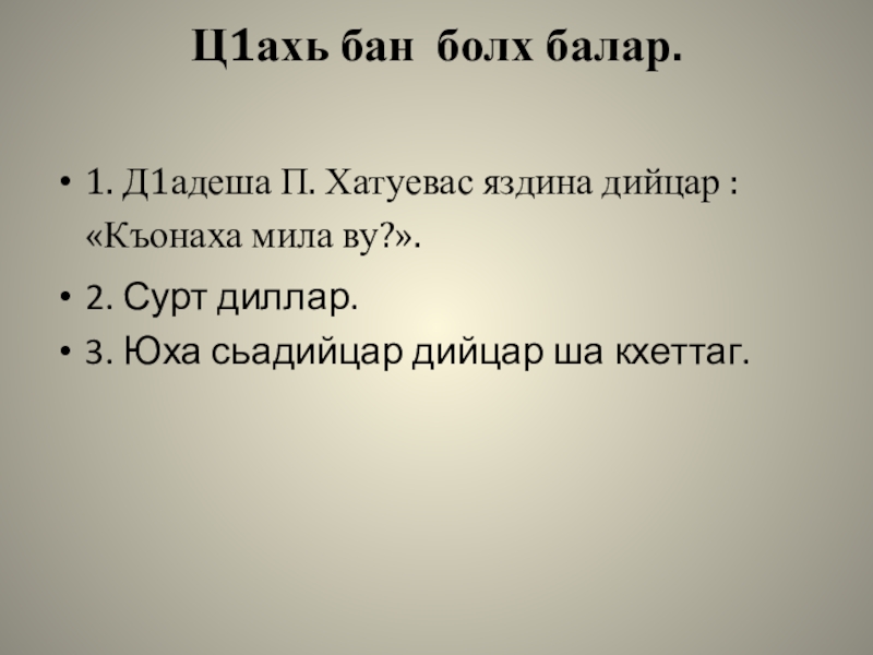 Ц1ахь бан болх балар. 1. Д1адеша П. Хатуевас яздина дийцар : «Къонаха мила ву?».2. Сурт диллар.3. Юха